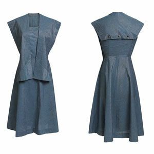 A manner reminiscent of the 1950s, this wrap-front dress is fitted through the shoulders, bust, and waist and flared from the hipline to the hemline, which ends only below the…